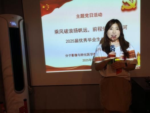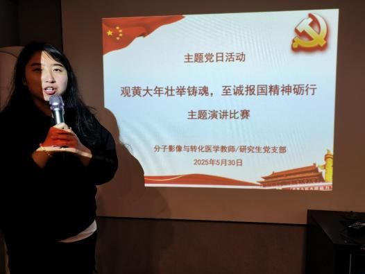 随后,师生党支部举行了“观黄大年壮举铸魂,至诚报国精神砺行”演讲比赛,学习黄大年心有大我、至诚报国的爱国情怀,并结合分子影像技术攻关,宣誓以“十年磨一剑”的韧劲破解“卡脖子”难题。