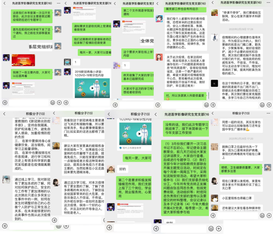 为深入贯彻落实习近平总书记对防控疫情的重要指示和讲话精神,号召全体师生“众志成城,共渡时艰”凝聚力量,做好“停课不停学”相关工作,加强疫情防控宣传教育,365best体育亚洲官网先进医学影像研究生党支部积极组织和推动支部全体党员进行线上学习,同时积极组织线上支部活动。
