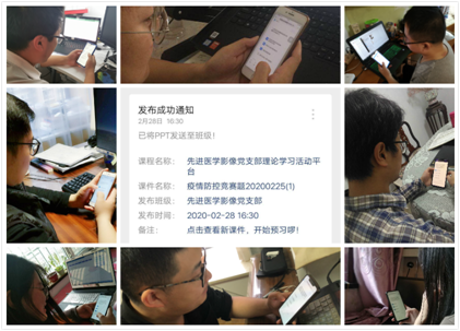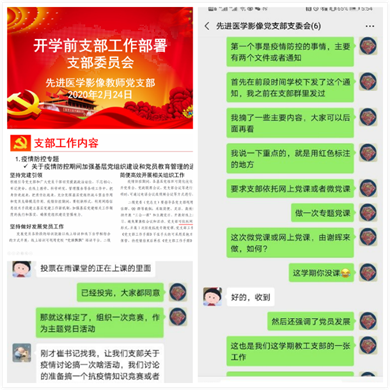 抗击疫情刻不容缓,疫情防控关系着每个师生的生命健康,而每个师生的关注和付出,都将成为战胜疫情的重要力量。2020年2月24日晚,先进医学影像教师/研究生党支部及时响应,高度重视,通过雨课堂和微信召开支部委员会,根据《习近平总书记关于疫情防控工作重要讲话和指示精神》、《习近平:在中央政治局常委会会议研究应对新型冠状病毒肺炎疫情工作时的讲话》,结合《关于疫情防控期间加强基层党组织建设和党员教育管理的通知》与《支部党员疫情防控专题培训》的具体要求,讨论了依托微党课或线上党课形式开展一次疫情防控专题党课,进行一次专题学习支部会,并基于疫情防控专题开展一次主题党日活动。
