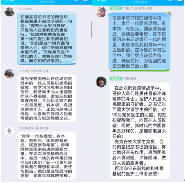 17级的王佳同学说:“习近平总书记的回信让我联想到几天前的思政课,其中有一句话我印象很深:时代变了,但党员的本色和本分没有变。北大援鄂医疗队90后的党员们就是新时代的青年,他们不畏艰险,冲锋在前。我们的身份虽然不是白衣天使,但我们同样是新时代青年的一份子,同样应该勇担大任。我也要用行动证明自己,交上合格的答卷。”