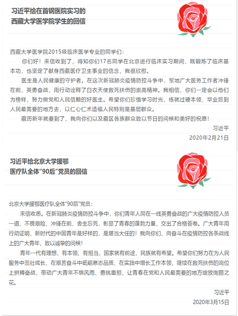 3月15日,总书记再次给北京大学援鄂医疗队全体“90后”党员回信,向他们以及奋斗在疫情防控各条战线上的广大青年致以诚挚的问候。