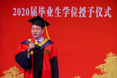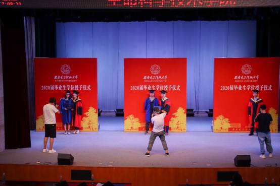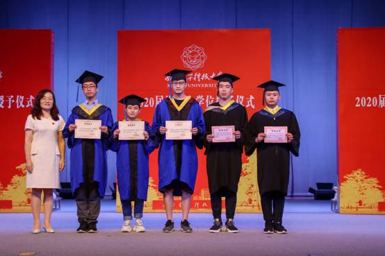 王丽玲为获得学校毕业之星提名、优秀毕业生标兵、优秀毕业生干部和优秀毕业生的同学颁奖。王忠良宣布授位决定,并与石光明、吕锐婵为学院2020届毕业生拨正流苏、颁发学位证书,并合影留念。