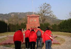 为缅怀革命先烈,瞻仰前辈风采,全体队员登上山顶,怀革命先烈之理想,肃穆景仰,面向祭坛鞠躬致敬。在苍松翠柏掩映下,纪念碑显得庄重肃穆,黄白相间的菊花和环圈寄托着人们对革命先烈的哀思。