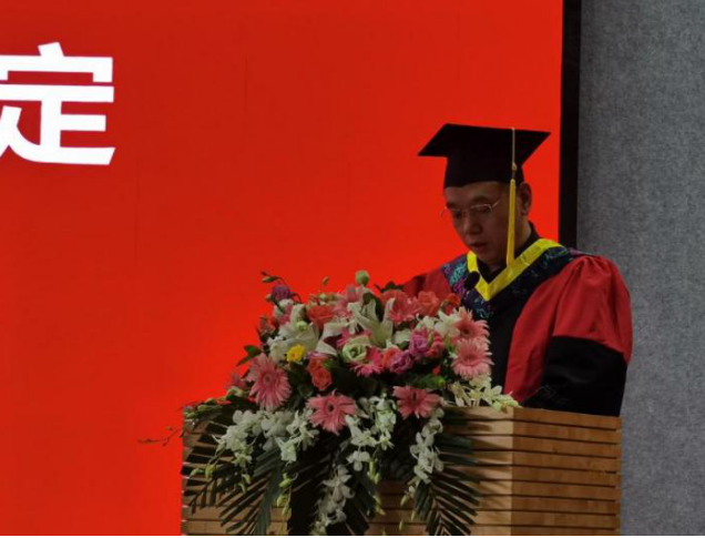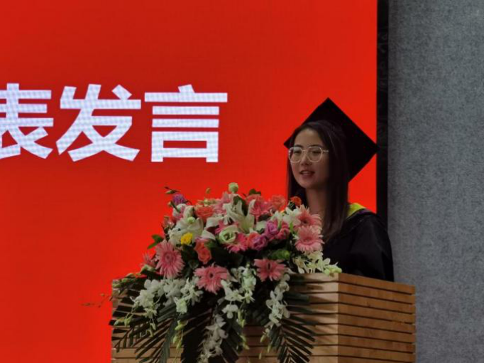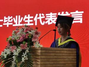 王佳代表本科毕业生发言。她带领大家回顾了大学生活中的记忆点滴,表达了对母校、对老师的感激之情,并祝愿毕业生们坚守心中的梦想、坚定心中的理念、坚持心中的热情,永远心怀感恩、放飞梦想、勇往直前,书写属于自己的无悔人生。