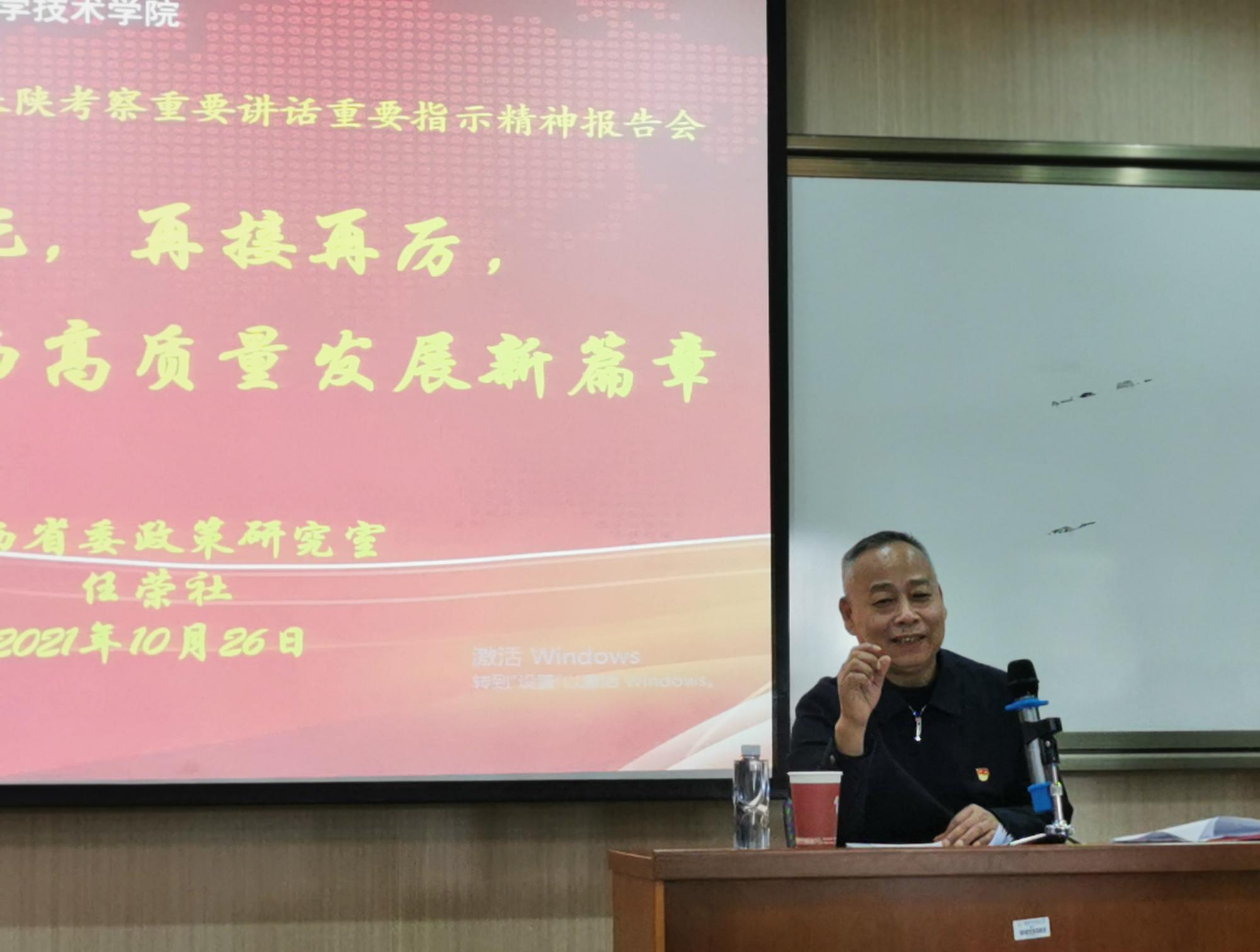 报告最后,学院副处级组织员王敬涛代表学院对任荣社主任带来的精彩报告表示感谢。他表示,任主任理论功底深厚,实践经验丰富,对于国情和省情的认识把握非常到位。举办此次报告对学院深入推进党史学习教育,深入贯彻落实习近平总书记来陕考察重要讲话重要指示精神有重要意义。学院也将坚决贯彻落实指示,牢记嘱托、再接再厉,为奋力谱写陕西发展新篇章做出生科院应有的贡献。