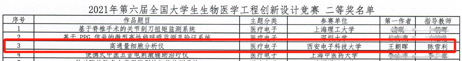 近日,2021年第六届全国大学生生物医学工程创新设计竞赛决赛在中山大学以线上方式顺利举行。经过预赛和决赛的激烈角逐,生科院参赛作品《Smartphone-CT: 基于智能手机的成像实践平台》(指导教师:朱守平,参赛学生:李蕾、栗军涛)获全国一等奖;《高通量细胞分析仪》(指导教师:陈雪利,参赛学生:王朝晖、孙瑞璟、周秋园)获全国二等奖;《基于3D打印技术的便携式微流控荧光检测PCR仪》(指导教师:胡波,参赛学生:杨晨曦、陈闯、王蔚璎)获全国三等奖。