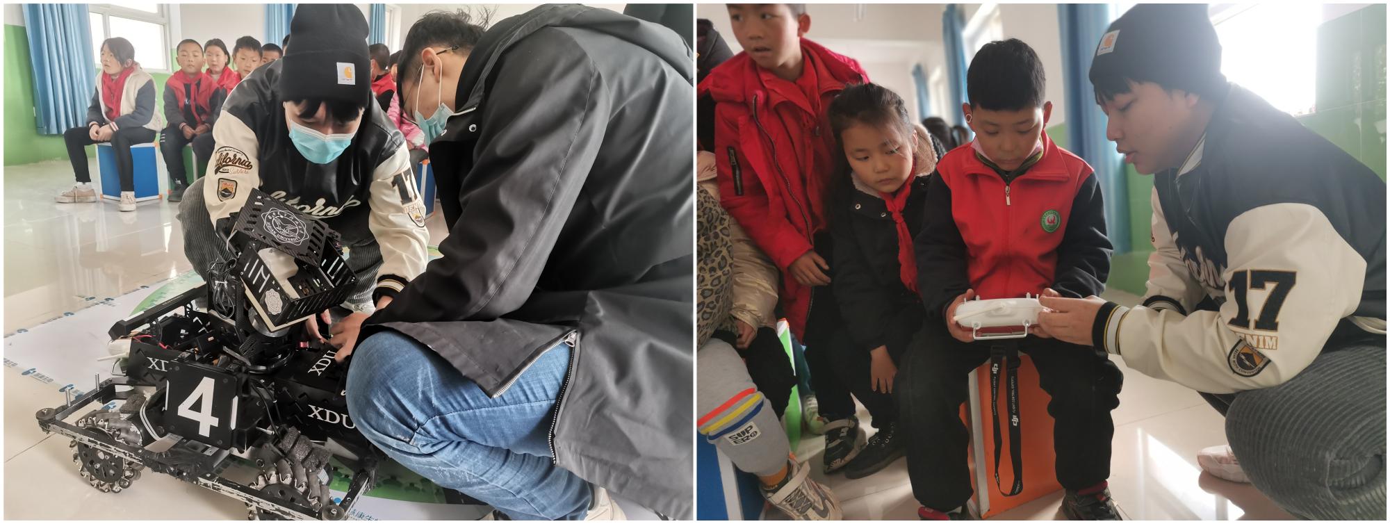 学院高度重视与钤铒小学的对接帮扶工作,依托学院特色探索并打造了系列科普课程。来自西电“Irobot”机器人战队的两位同学通过展示步兵机器人,为孩子们上了一堂别开生面的科技体验课。两位同学全方位讲解了机器人的结构和操作方式,并作了发射小球的演示,激发了孩子们极大的兴趣。在两位同学的引导下,每个孩子都体验了操作机器人的快乐和新奇。在欢声笑语中,进一步加深了孩子们对科技、机械的认识。