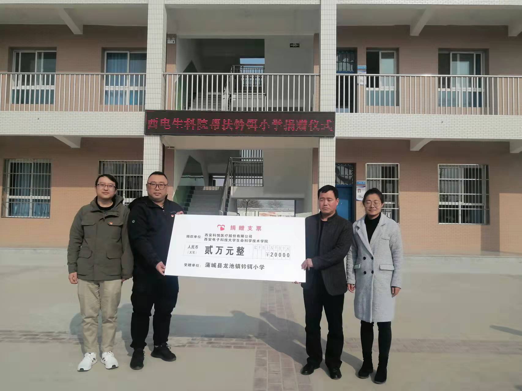 活动最后,在李斌校长的主持下,西电生科院帮扶钤铒小学捐赠仪式正式开始,刘鹏教授代表学院和西安科悦医疗股份有限公司向钤铒小学捐赠帮扶资金2万元以及篮球、足球、打印纸等文体用品。王丽玲鼓励老师们创新工作思路,不断拓展教育教学方法,立德树人,培养优秀学生;希望孩子们刻苦学习,成人成才,将来回报社会。