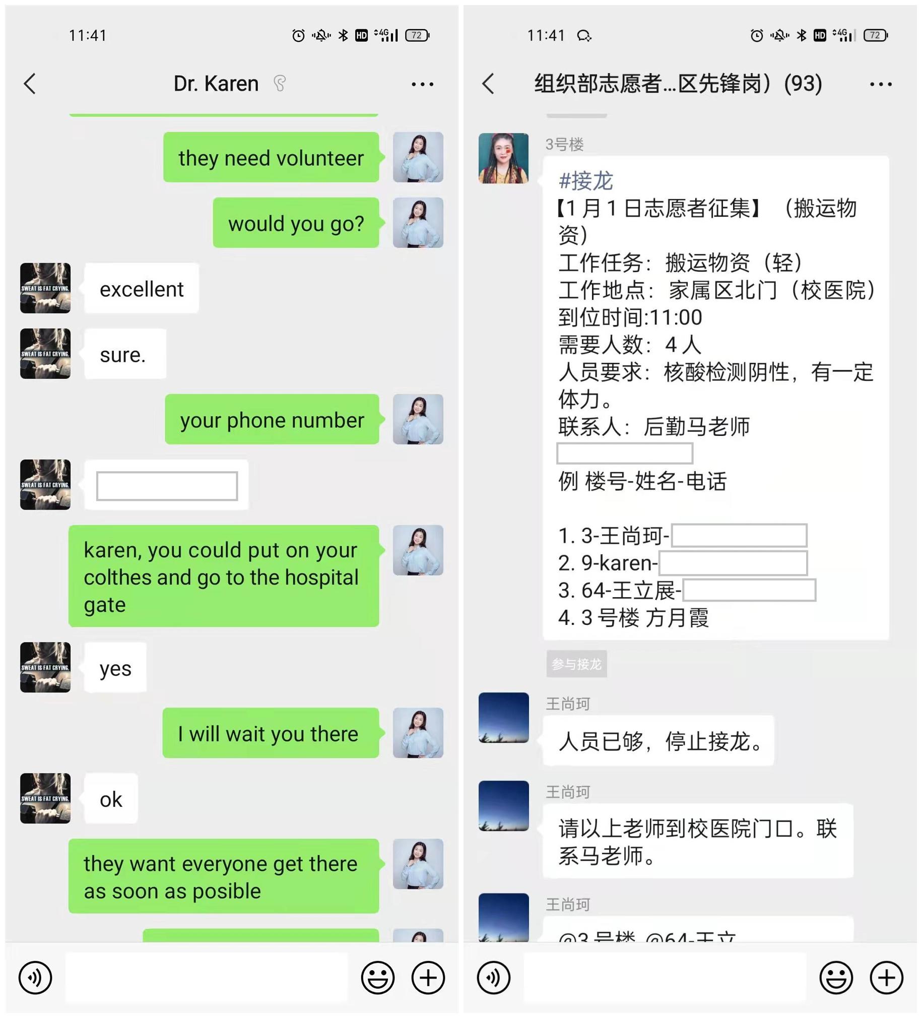 经过一周多的居家隔离和社区的核酸检测,Karen亲眼见证了社区里不分男女、老幼积极担任志愿者,齐心协力共渡难关的动人场面,被大家的无私帮助和中国人不畏困难、精诚合作的抗疫精神所感动,主动申请参与到志愿者工作中去。在社区的安排下,在2022年的第一天已经积极参与了社区鸡蛋搬运和配送的工作。她表示,后期将会责无旁贷完成其他需要她做的工作,也愿意为学校抗击疫情出一份力。这正是爱心无国界的最好体现。