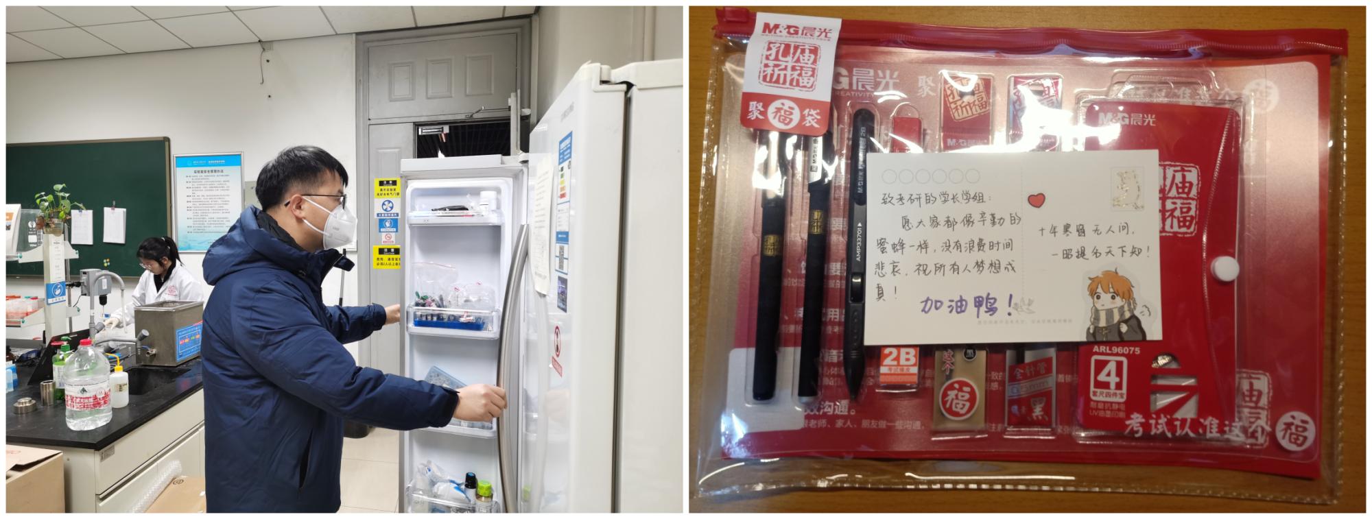 在研究生考试前夕,学院为每位考研学子精心准备了文具礼袋、牛奶、口罩、手写贺卡等暖心大礼包,并帮助每位学生打印了准考证,表达了全院师生对考研学子最真挚的祝福。
