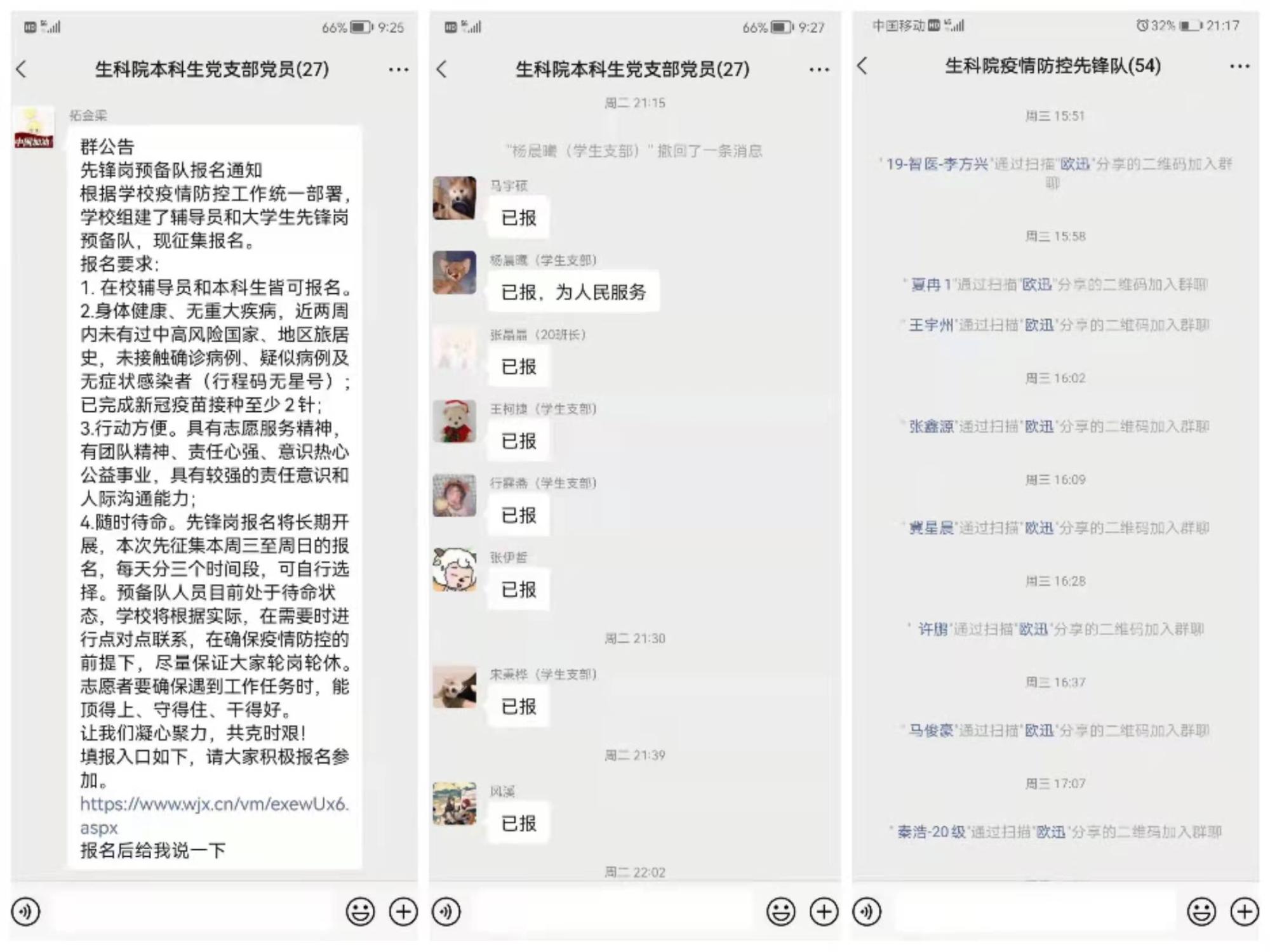 本科生党支部多次召开支部党员大会,传达疫情防控要求,教育引导全体学生要坚决服从学校管理,严格遵守各项疫情防控制度,积极配合疫情防控工作,并号召支部党员、积极分子在关键时刻要提高政治站位,以身作则,挺身而出,充分发挥先锋模范作用。大家积极响应,踊跃投身战疫一线践行初心使命,用担当奉献构筑阻击疫情的“红色堡垒”,支部第一时间组建了疫情防控先锋队。