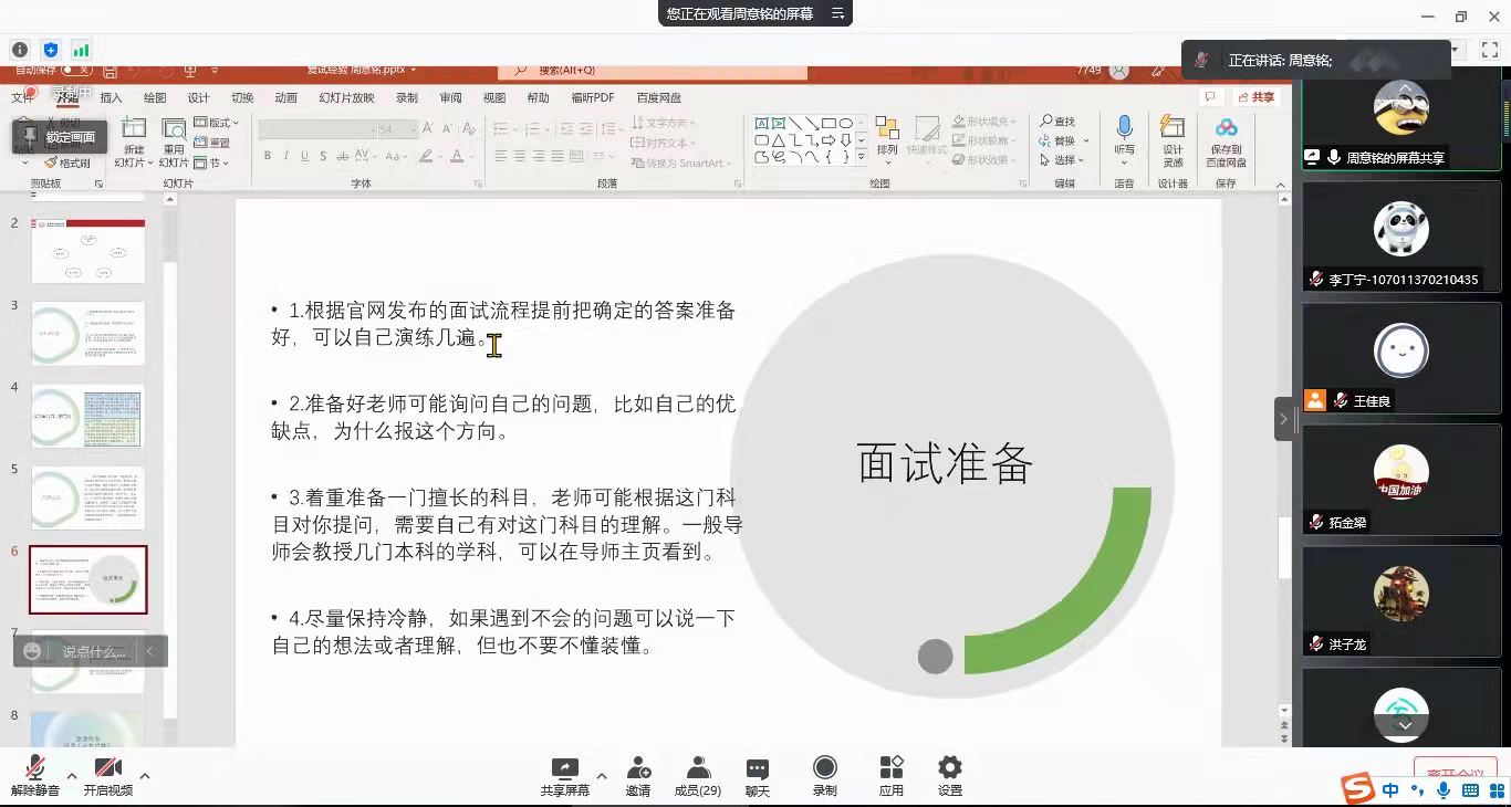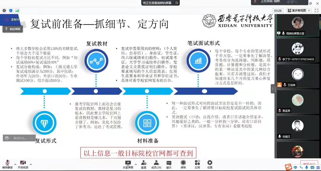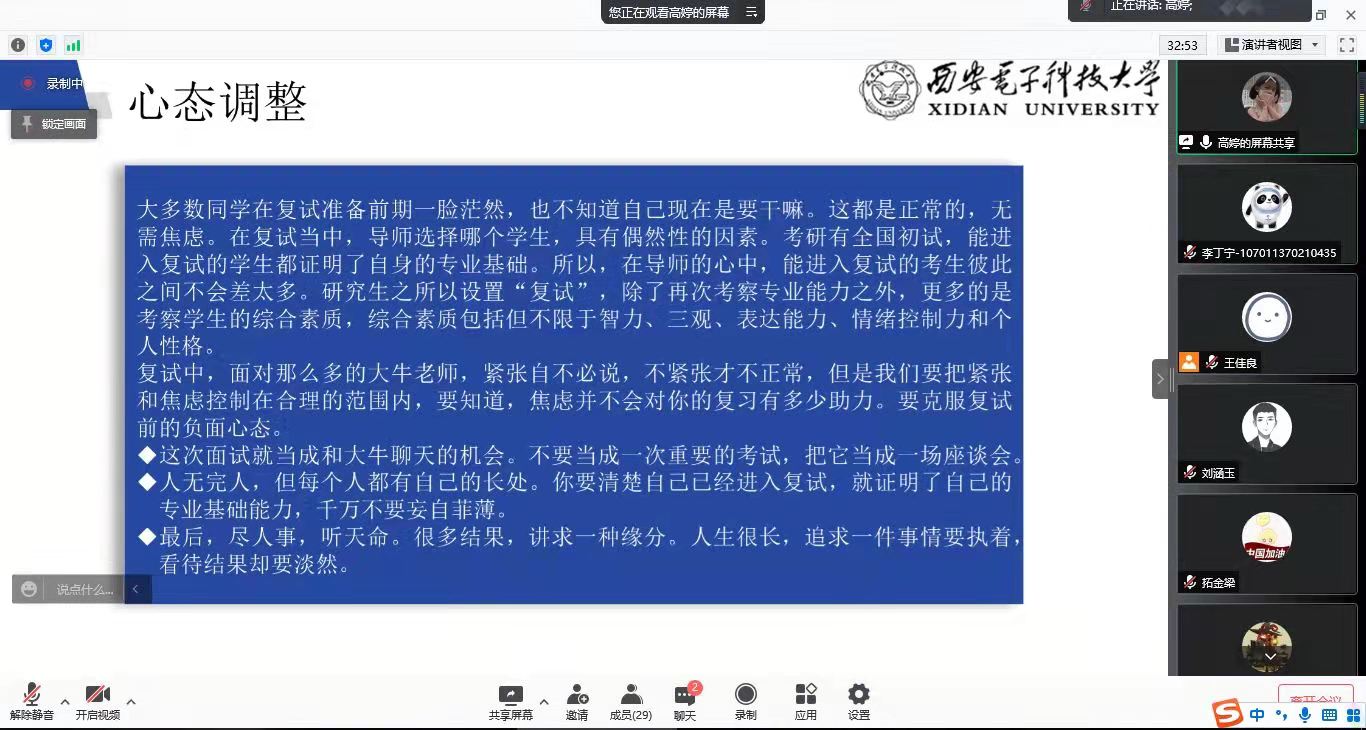 交流会上,四位研究生同学分别从复试前准备、联系导师、线上复试、专业课选择、复试调剂和心态调整等几个方面进行了经验分享,并结合个人经验向各位考研学生们分享了复试各个方面的具体内容。