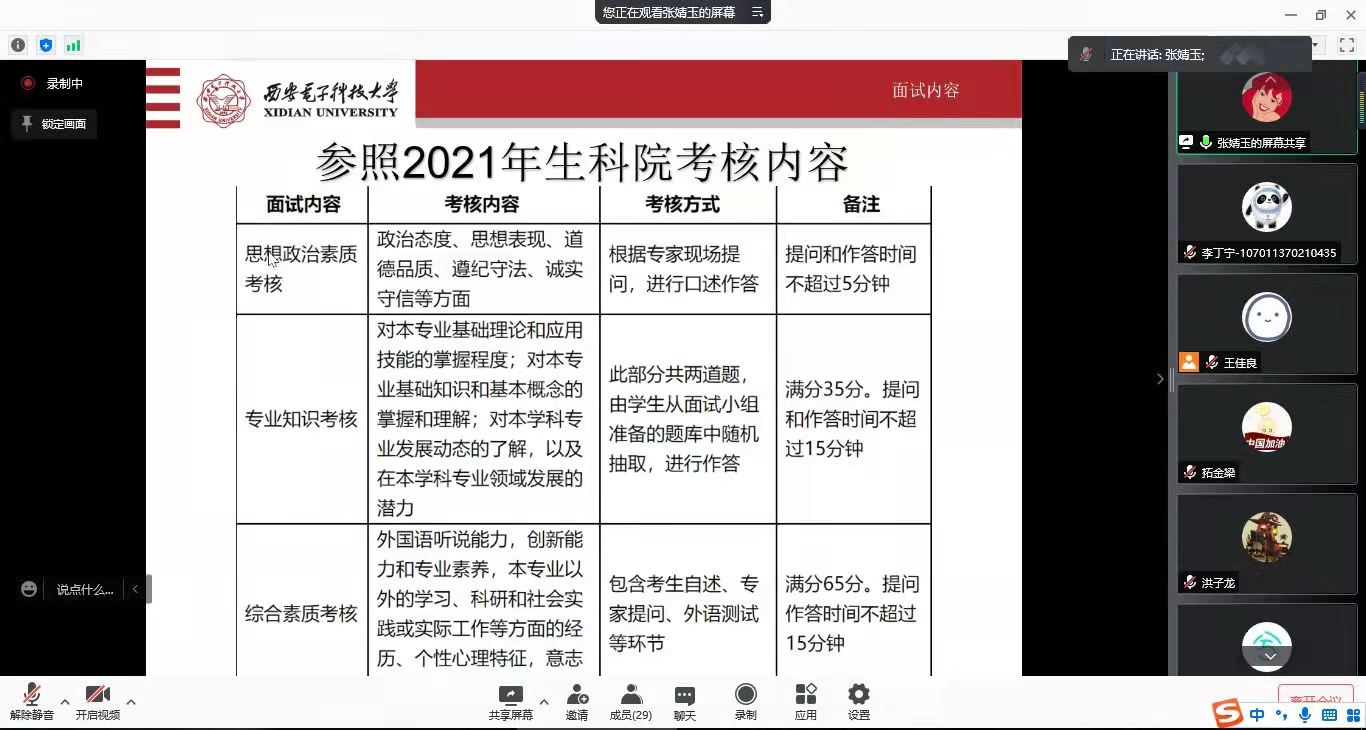 张婧玉同学参照2021年生科院复试考核的内容,向各位考研学生讲述了线上复试的面试内容、考核内容和考核方式等几个方面。她对专业课备考重点进行了详细介绍,并提醒各位学弟学妹们注意专业课的准备,指出专业书籍和视频等资源获取的方法,在回答问题时要观点突出,逻辑清晰,要体现出自己分析问题、解决问题的能力。