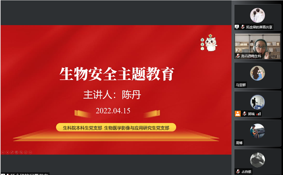 其次,为深入学习贯彻落实习近平总书记“把生物安全纳入国家安全体系”重要论述,让同学们更直观地理解生物安全相关知识,培养同学们对专业的兴趣,4月15日下午,365best体育亚洲官网本科生党支部联合生物医学影像与应用研究生党支部举办生物安全教育主题线上讲座,365best陈丹老师担任主讲嘉宾,会议由辅导员郭瑞主持,共计70余人线上参会。