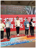 张毅老师获得教工男子青年组足球绕杆射门第一名,Karen老师获得教工女子中年乙组铅球第一名,吕锐婵老师获得教工女子中年甲组100米第一名、中年甲组800米第三名,张象涵老师获得教工女子中年甲组1分钟跳绳第一名,学院女子团体4*100米接力第二名。