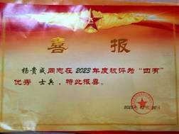 杨贵成的班长乔平彪同学接过喜报和证书,看到“四有”优秀士兵证书上“有灵魂、有本事、有血性、有品德”12个红色大字,激动地说:“贵成同学在日常生活中乐于助人,学习上努力刻苦,工作上认真负责,不知不觉他去部队一年多了,非常想念他。贵成同学在高海拔青藏高原执勤、训练,有听党话、跟党走的灵魂;有保家卫国的本事;有掉皮掉肉不掉队的血性;有青春年华奉献边关的品德,是我们学习的好榜样,我们要向贵成同学看齐,学好专业技术,赓续红色血脉,做‘有理想、肯奋斗、能吃苦、有担当’的新时代大学生。”