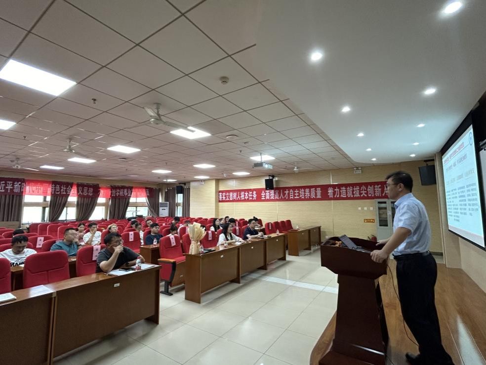 “师德标兵”董明皓结合个人成长发展经历进行了师德师风宣讲,他勉励全体青年教师要恪守师德规范,不断开阔眼界,既要仰望星空也要脚踏实地,在保持学术定力的同时不断迭代学术方向,以三十年为尺度讲好每一堂课。他指出,作为教师要时刻牢记立德树人根本任务,以“四有”好老师标准严格要求自己,做学生为学、为事、为人的大先生。