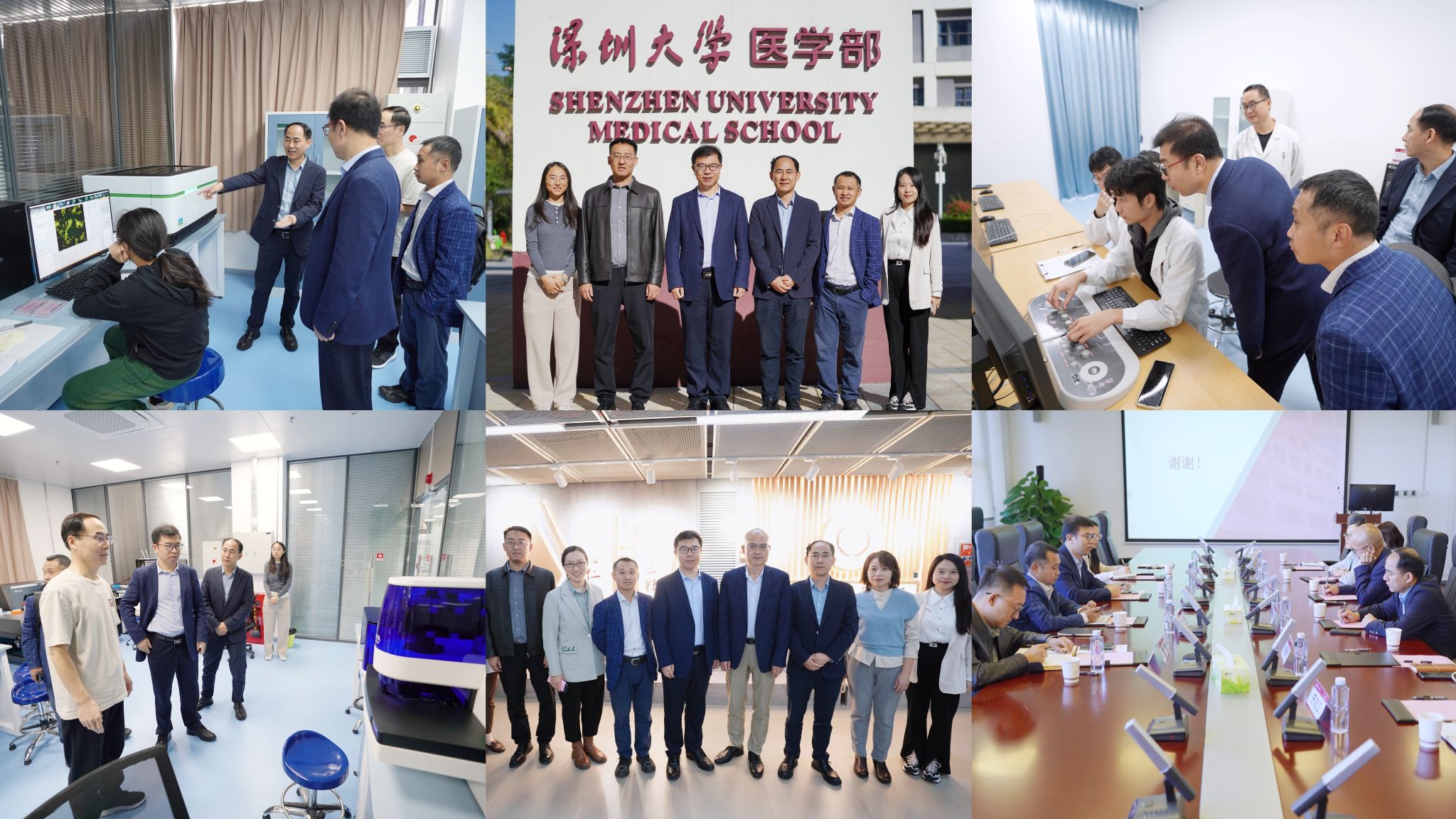 26日上午,学院调研团来到深圳大学医学部。在医学部副主任黄鹏的带领下,现场参观了活细胞超分辨成像平台、病理分析平台、小动物影像平台、核磁平台、质谱平台、电镜平台等。座谈交流环节,医学部执行主任许兴智从发展历程、人才培养体系、教育教学成果、科学研究成果、国际合作交流等方面介绍了医学部的基本情况;王忠良介绍了学院的学科方向、牵头的“十三五”“十四五”重大项目和发表的高水平论文等标志性成果以及在国际化方面的成效和短板。会上,双方就如何推进学科建设、如何引进高层次人才、如何建立医工交叉合作机制、如何激励教育教学改革、如何加强国际合作与交流、如何实现优势互补等问题进行了深入讨论。