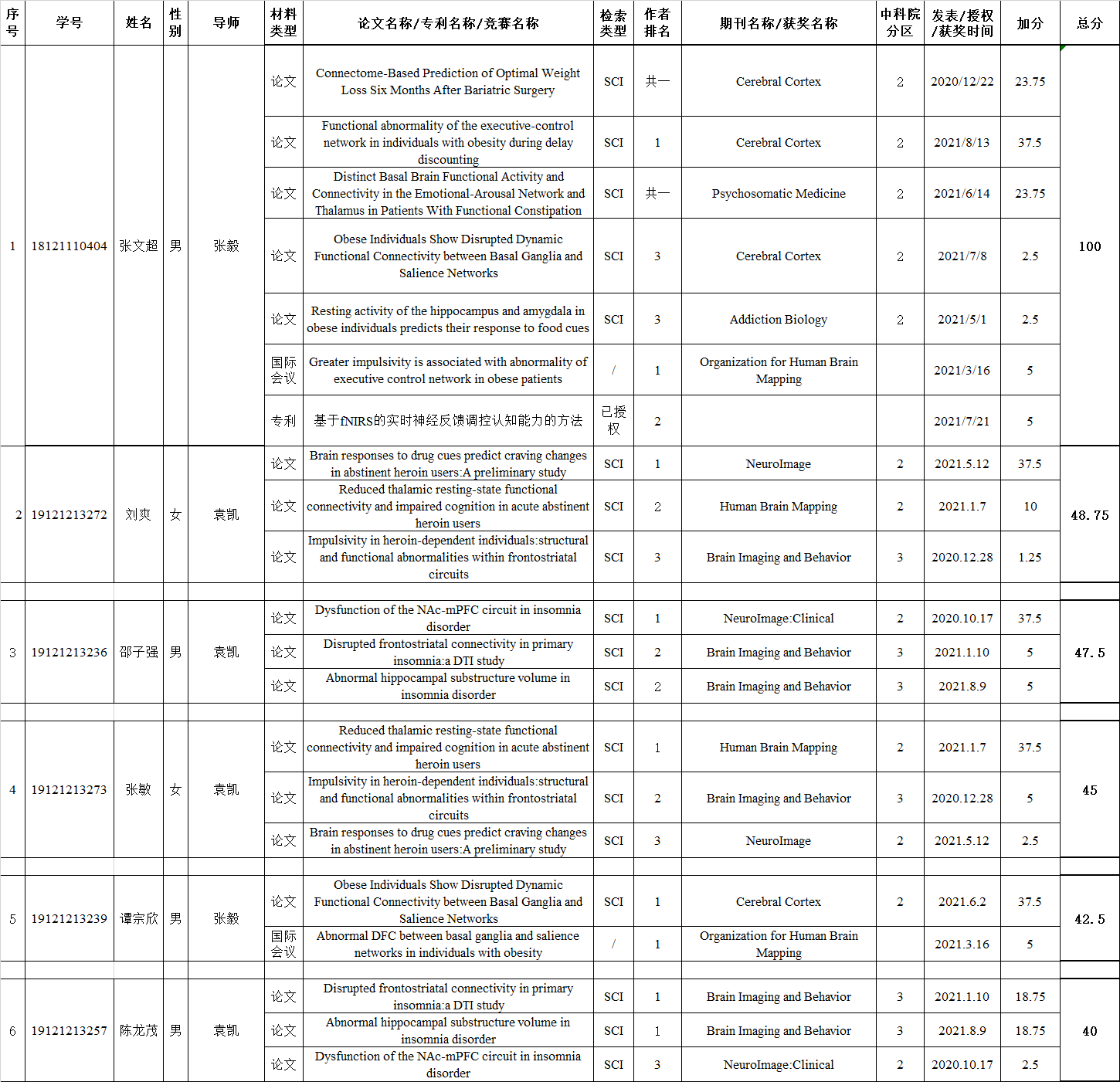 ③取得的各类成果:包括学术论文、授权专利、竞赛获奖等,成果需按照重要程度及规范进行分类列表,标识清楚成果的主要信息,例如学术论文须标明论文名称、作者姓名、录用发表状态、发表录用日期、期刊、卷期页码、检索情况、分区情况(按照中科院JCR大类分区)、影响因子、个人排名等;