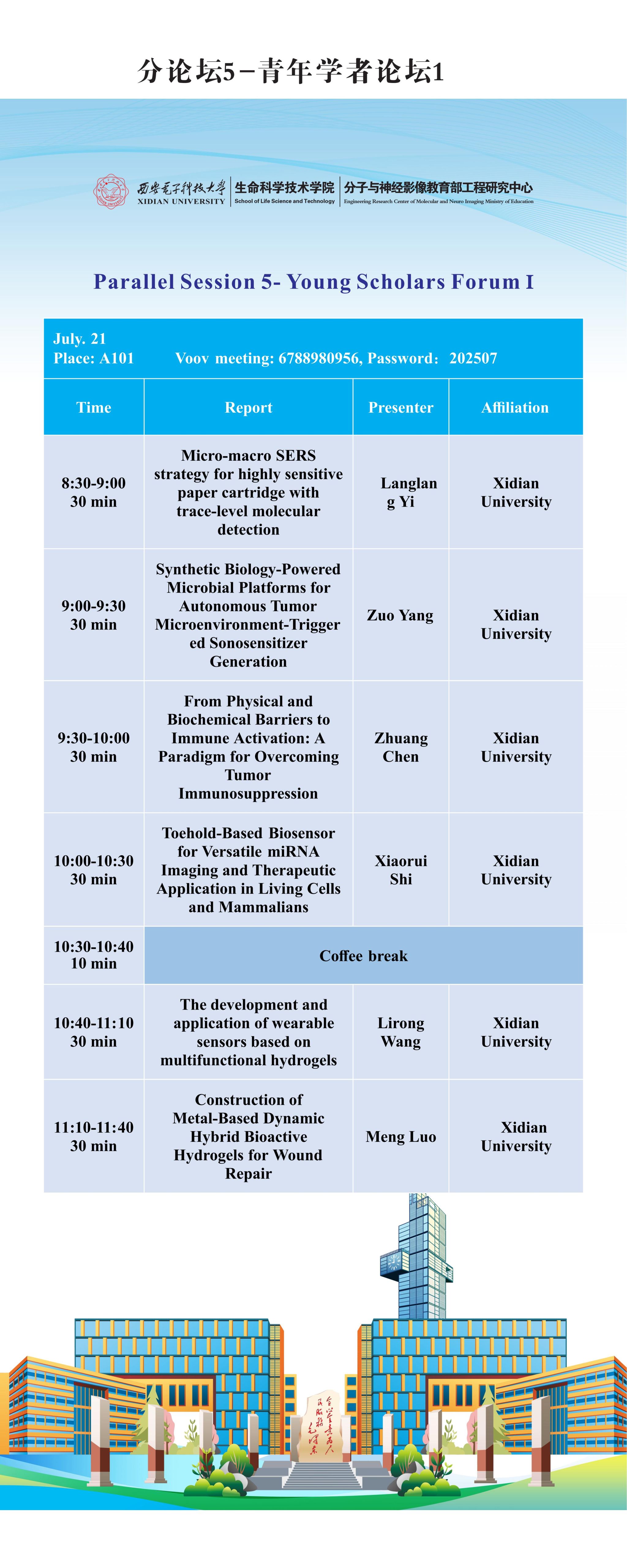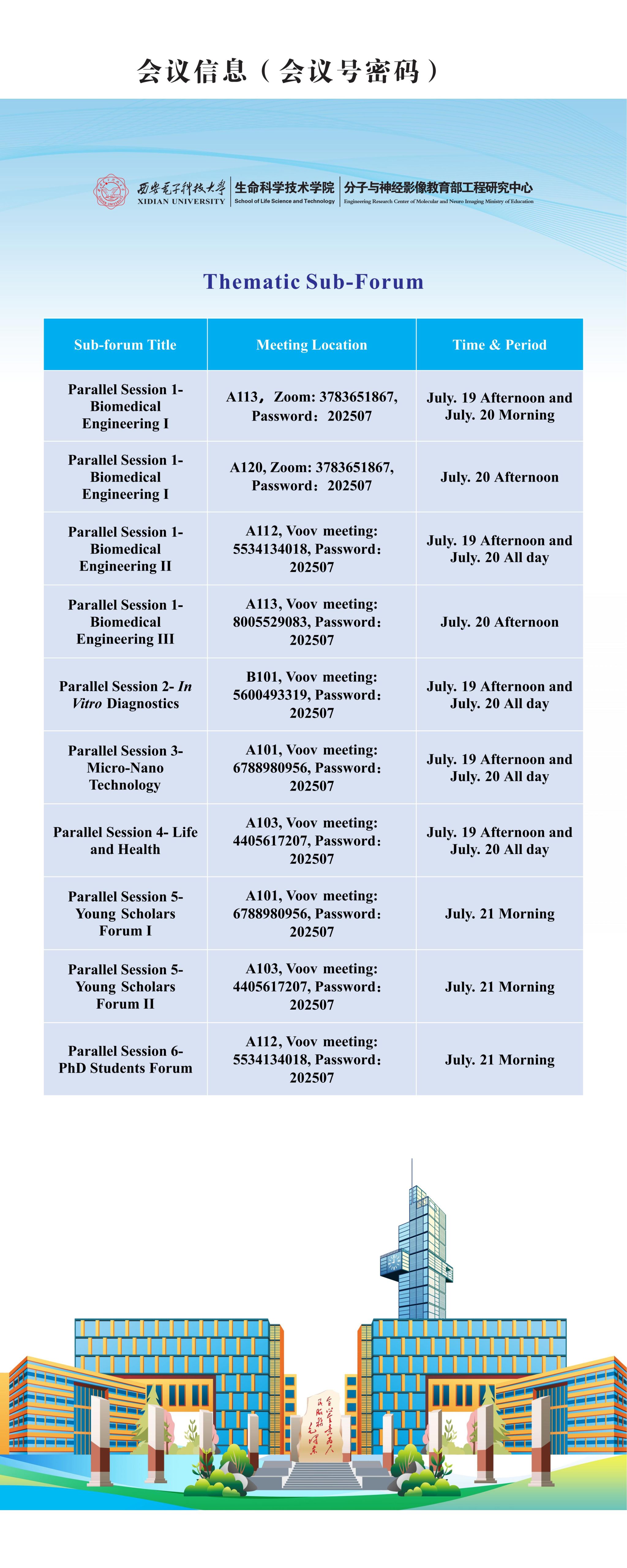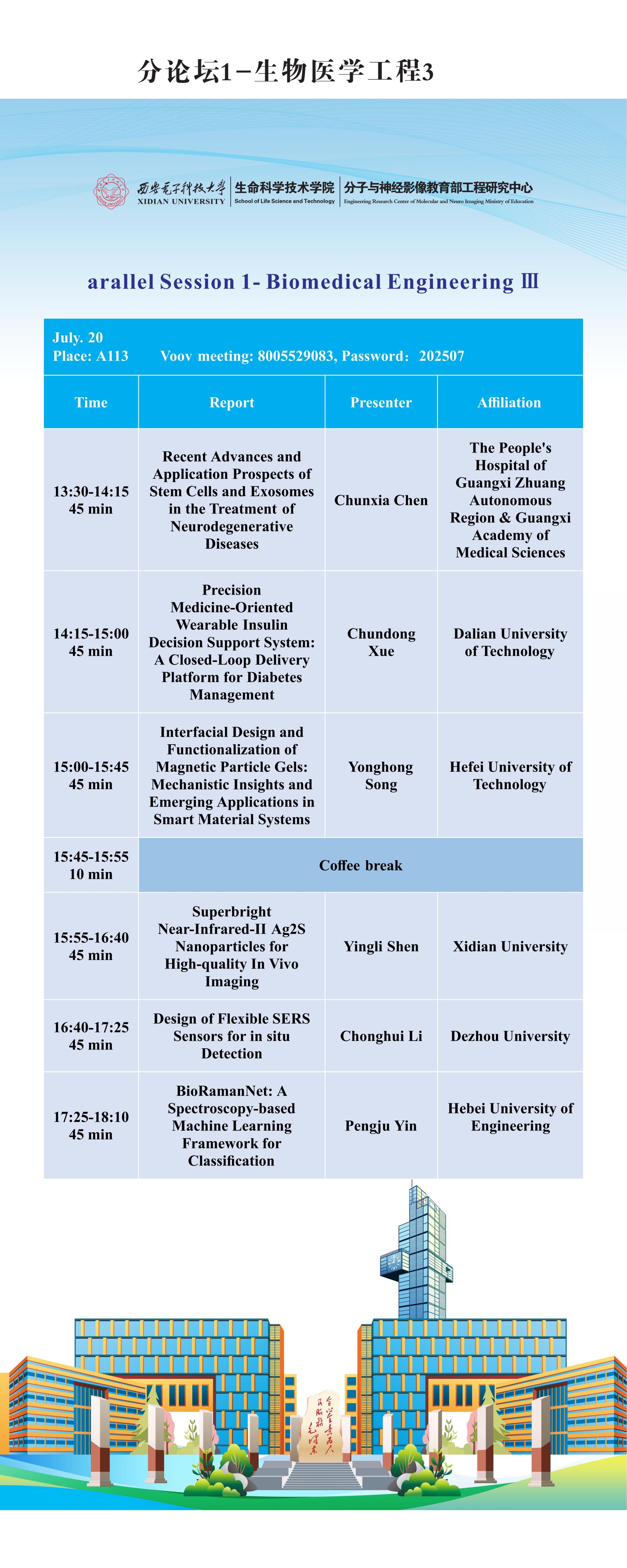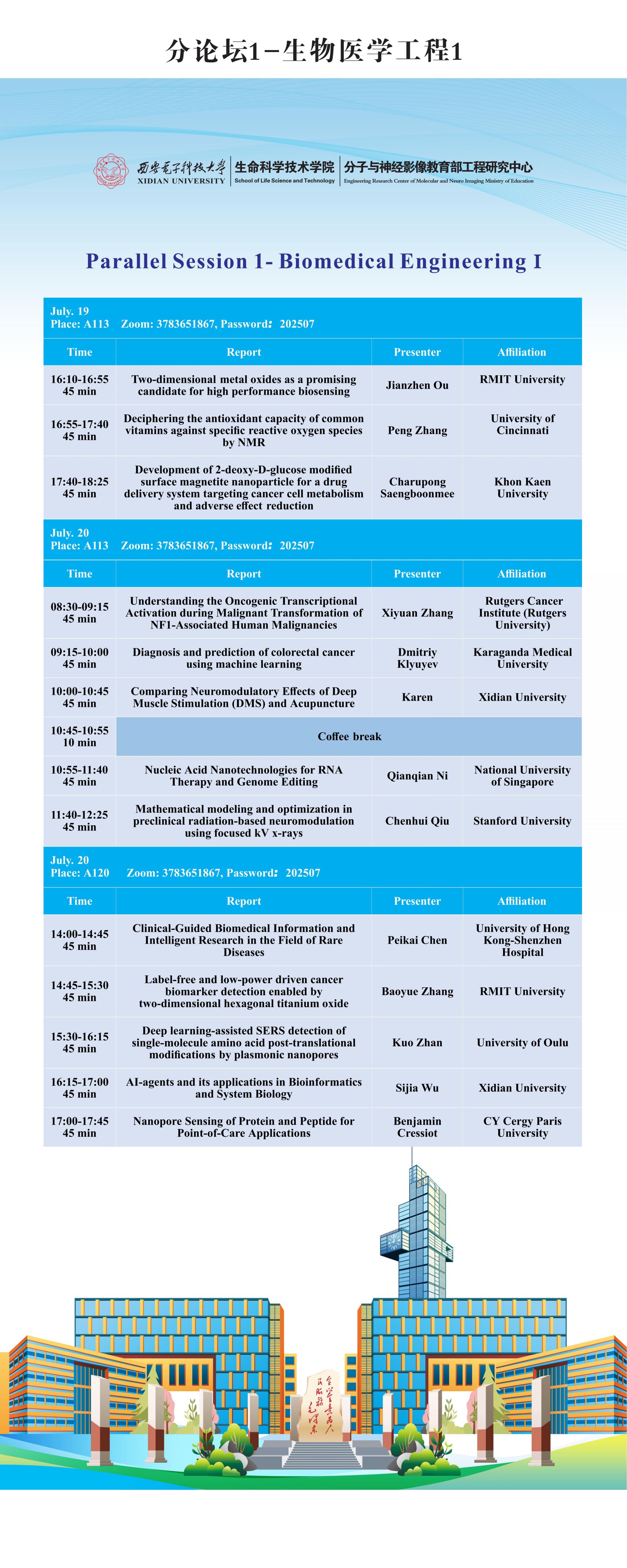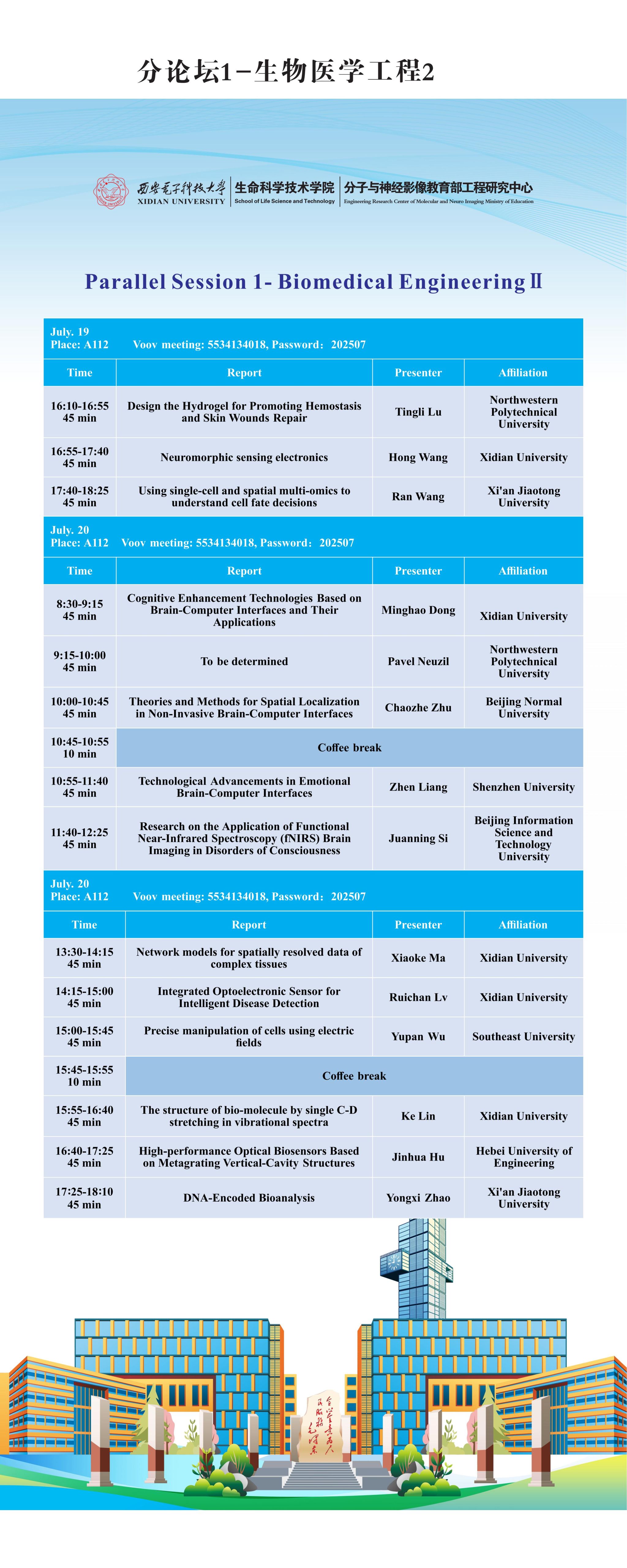 Parallel Session 1- Biomedical Engineering II | A112 腾讯会议号:5534134018 密码:202507 | July. 19 Afternoon and July. 20 All day |