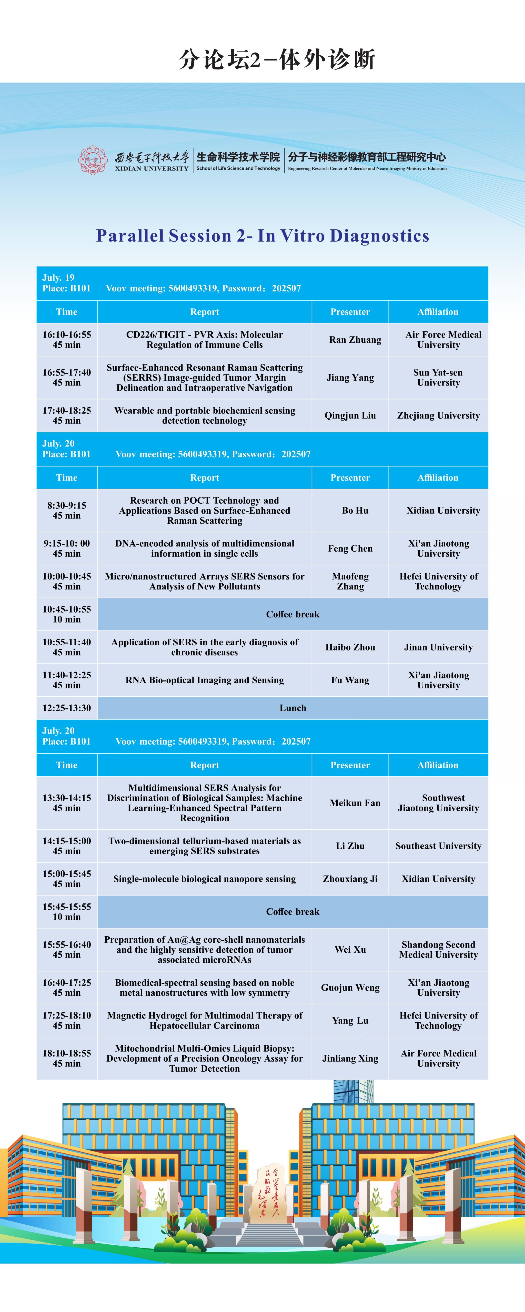 Parallel Session 2- In Vitro Diagnostics | B101 腾讯会议号:5600493319 密码:202507 | July. 19 Afternoon and July. 20 All day |