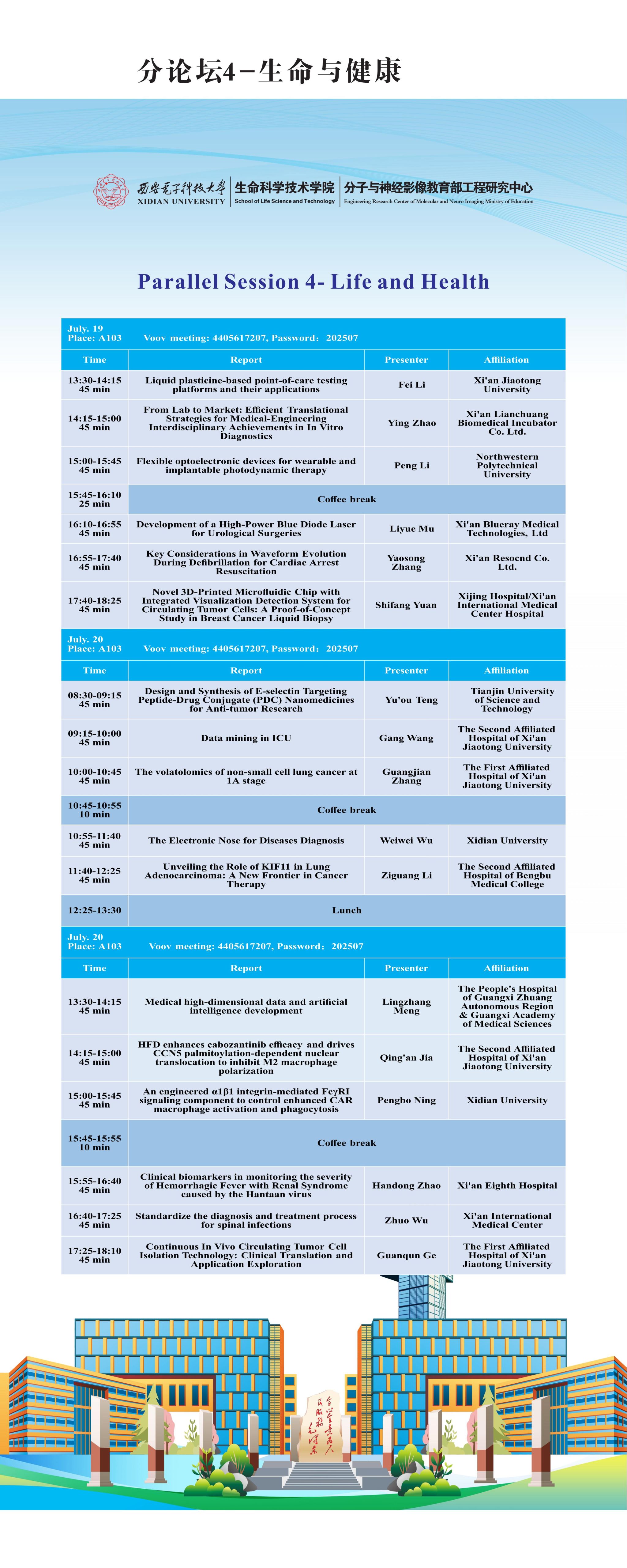 Parallel Session 4- Life and Health | A103 腾讯会议号:4405617207 密码:202507 | July. 19 Afternoon and July. 20 All day |