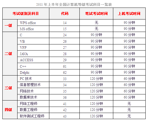 六、等级考试科目与考试时间详见下表: