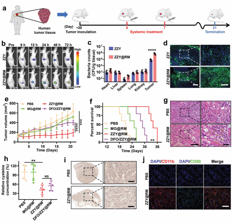 ZZY@RM在皮下移植瘤、原位模型及患者来源异种移植(PDX)模型中均证实显著疗效:肿瘤抑制率超90%,生存期延长2倍以上。机制研究表明,工程菌不仅能重塑肿瘤免疫微环境,促进M1型巨噬细胞极化,还可通过免疫原性细胞死亡激活适应性免疫。该成果为开发代谢干预-免疫调控协同的抗癌疗法开辟了新路径。