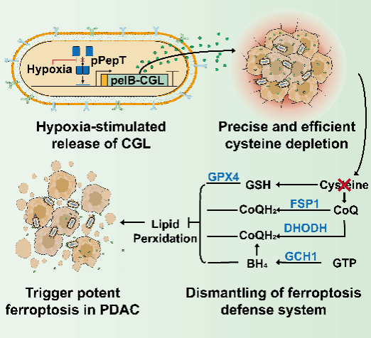 由KRAS基因突变驱动的胰腺导管腺癌(PDAC)代谢重编程是导致其化疗耐药性的重要因素。然而,KRAS突变所引起的代谢改变也带来了一些独特的代谢“弱点”,特别是在铁死亡这一由铁依赖的脂质过氧化反应介导的细胞死亡形式中。这为利用这些代谢弱点来治疗PDAC提供了一个有前景的新思路。然而PDAC细胞通过多重代谢通路建立起了坚固的自我保护体系,使铁死亡难以有效触发。基于此,研究团队通过临床样本的转录组学分析发现,PDAC耐受铁死亡的根源与半胱氨酸代谢密切相关,但现有半胱氨酸代谢干预策略存在靶向性不足和代谢补偿效应等问题。受自然界硫循环的启发,团队利用非致病性大肠杆菌构建了智能工程菌(ZZY@RM),通过缺氧响应元件精准调控胱硫醚裂解酶(CGL)表达,实现肿瘤微环境特异性半胱氨酸耗竭。实验结果表明,该工程菌能够持续且长效分解胞内外半胱氨酸,瓦解GPX4-GSH等肿瘤铁死亡防御系统,从而诱导PDAC强效铁死亡。