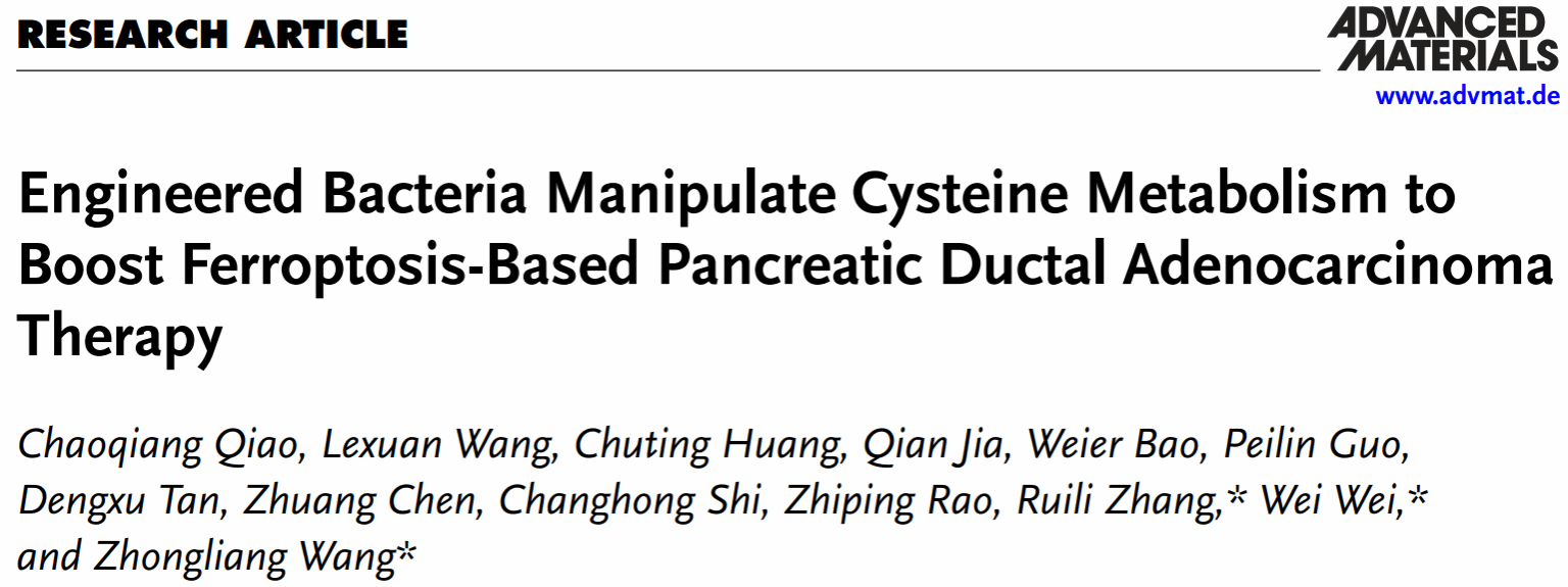 (通讯员 乔晁强)近日,365best体育亚洲官网王忠良教授团队在材料类国际顶级期刊《Advanced Materials》(中国科学院I区TOP期刊,影响因子27.4)发表了题为《Engineered Bacteria Manipulate Cysteine Metabolism to Boost Ferroptosis-Based Pancreatic Ductal Adenocarcinoma Therapy》的研究论文。论文第一通讯单位为365best体育亚洲官网,合作单位包括中国科学院过程工程研究所和空军军医大学。论文第一作者为365best体育亚洲官网青年教师乔晁强,论文通讯作者为365best体育亚洲官网王忠良教授、张瑞丽副教授及中国科学院过程工程研究所生化工程国家重点实验室魏炜研究员。该研究围绕胰腺导管腺癌(PDAC)难治的临床问题,提出了一种微生物仿生治疗策略,通过工程化益生菌调控半胱氨酸代谢,诱导铁死亡,从而有效抑制肿瘤生长。