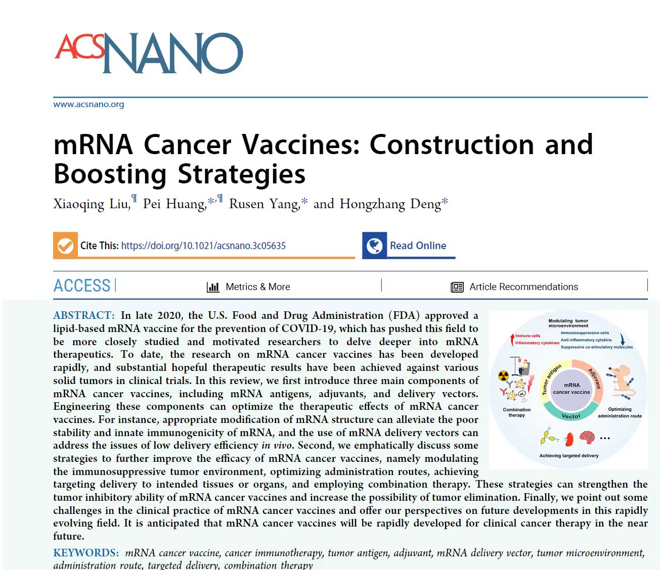 (通讯员:刘小庆)近日,365best体育亚洲官网邓宏章教授在国际知名期刊《ACS Nano》(中科院一区,IF= 17.1)发表了题目为:mRNA cancer vaccines: construction and boosting strategies的论文,概述了mRNA癌症疫苗的最新研究进展。对传统疫苗设计与机器学习辅助设计纳米疫苗等新兴策略进行了详细讨论。