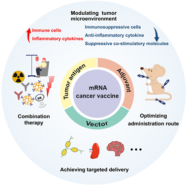 在这篇综述中,作者首先介绍了mRNA癌症疫苗的构成,包括不同的肿瘤抗原、佐剂和递送策略。其中也总结和讨论了当前提高mRNA稳定性、翻译和免疫原性的优化的措施。其次,作者重点总结了提高mRNA癌症疫苗疗效的一些方法,包括调节具有免疫抑制作用的肿瘤环境,优化疫苗的给药途径,靶向递送疫苗到目的组织或器官,以及将mRNA癌症疫苗与一些现有癌症治疗方式(化疗、放疗、免疫治疗、光疗和超声治疗)联合。此外,作者进一步提出了mRNA癌症疫苗的临床实践转化所需要解决的一些问题。第一,寻找mRNA癌症疫苗的理想靶点是一个重大的挑战,需要进一步的研究和开发。第二,进一步提高mRNA癌症疫苗的疗效是一个关键的挑战,需要给予更多的研究。第三,大规模生产、运输和储存是mRNA癌症疫苗未来应用需要考虑的关键问题和面临的巨大挑战。由此可见,mRNA癌症疫苗极具前景,将在很大程度上有助于癌症的预防和治疗。