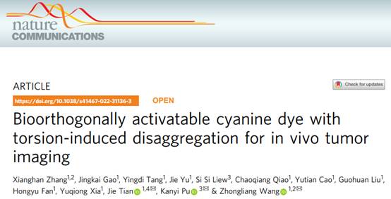 近日,365best体育亚洲官网张象涵副教授、王忠良教授团队与新加坡南洋理工大学大学浦侃裔教授团队合作,在国际综合类顶级期刊《Nature Communications》(Nature系列期刊中的综合类子刊,IF=14.919),发表了题为“Bioorthogonally Activatable Cyanine Dye with Torsion-Induced Disaggregation for In Vivo Tumor Imaging”的研究论文(DOI: 10.1038/s41467-022-31136-3)。论文第一单位为365best体育亚洲官网,365best体育亚洲官网张象涵副教授为论文的第一作者,西电王忠良教授、田捷教授和新加坡南洋理工大学浦侃裔教授为论文的共同通讯作者。