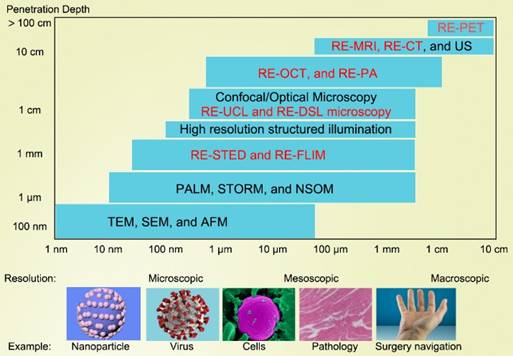 论文第二部分,详细介绍并回顾了稀土探针的生物应用。拥有UV/Vis的上转换和NIR II/NIR III区的下转换发光是稀土的一个显著优势,使其能够同时用于成像(细胞显微成像及活体多尺度成像)和光疗。在生物应用方面,具体体现在:用多壳纳米粒子在NIR II/NIR III进行具有最小副作用的靶向治疗;纳米光子探针的表面改性,用于体外/体内深层组织生物成像;多模态成像(如图为具有高分辨率和高穿透的成像手段,其中红色字体为稀土探针参与的成像手段);此外,稀土探针还可用于传感(精确的近红外荧光/寿命反映温度);成像引导的协同治疗(光动力疗法、光热疗法、光激活疗法);控制药物释放,提高药物利用率,进一步减小副作用。论文最后,提供了与临床治疗相关的稀土纳米探针的典例,如使用光遗传进行脑成像及疾病监测,使用开发的NIR II成像仪进行临床前手术导航,使用正交激光照射的疾病诊疗等,充分展示了NIR II成像探针及导航仪在疾病诊疗领域的潜在应用价值。