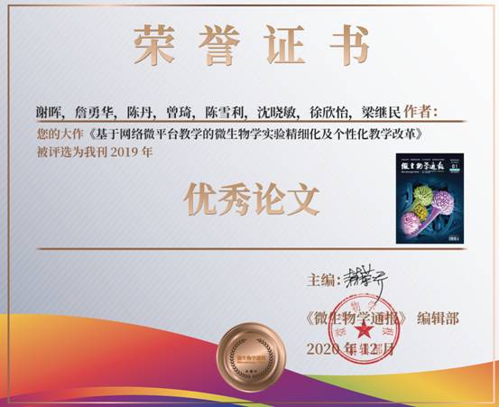 近日,365best365best体育亚洲官网谢晖副教授发表的信息化教学研究论文《基于网络微平台教学的微生物学实验精细化及个性化教学改革》入选国内权威期刊《微生物学通报》年度十佳优秀论文。《微生物学通报》根据发表文章的被引量、同行评价、下载量等数据,结合专家评审意见,评选出了10篇年度十佳优秀论文。