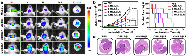 研究者选用金属有机框架材料(MOFs)作为纳米骨架,通过精细地结构调控实现了对狂犬病毒独特的子弹状形貌和尺寸的模拟;同时在其表面修饰了嗜神经性多肽RVG29的脂双层作为人造病毒外壳来模仿狂犬病毒的侵染性表面,最终构建出“形神兼备”的仿生纳米药物。研究者进一步对狂犬病毒形貌仿生与功能仿生的二元独立性和协同性进行了系统研究,结果表明:与单一的功能仿生或形貌仿生的纳米药物相比,“形神兼备”的协同仿生纳米药物的脑胶质瘤递送效率可提高3倍以上,高效还原了狂犬病毒特异性入侵中枢神经系统的性能,最终有效地改善治疗药物无法有效地穿越BBB到达癌变部位的窘境,显著提高药物的治疗效率。值得期待的是,作为一个可以高效穿越BBB的纳米递送平台,这种“形神兼备”的仿生纳米递药系统有望延伸到其他中枢系统类疾病的治疗中,应用前景广泛。