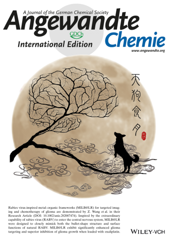 近半年来,尽管面临疫情的严重影响,分子影像与转化医学研究团队在学院领导的关心与支持下,在学术带头人王忠良教授的带领下,科研工作克服困难、迎难而上、不肯懈怠,取得了显著的研究成果,用实际行动展现了西电人在“新冠疫情大环境”下不畏困难,锐意进取的拼搏精神。7月1日,国际知名学术期刊Angewandte Chemie International Edition (期刊影响因子12.959)在线报道了该团队在脑胶质瘤精准诊疗方面最新的研究工作“Rabies Virus-Inspired Metal-Organic Frameworks for Targeted Imaging and Chemotherapy of Glioma”,同时被选为封面文章。