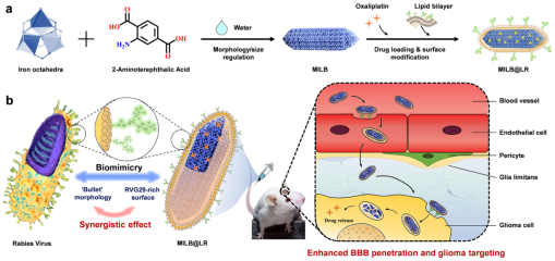 “学习自然,道法自然”,从大自然的生命体系中寻求解决方案是科学研究的永恒主题。受天然存在的中枢神经系统入侵者—狂犬病毒的启发,该团队创新性地提出了一种“形神兼备”的狂犬病毒纳米仿生策略:二元协同仿生策略,即结构仿生(“形”,即模仿物理形貌)与功能仿生(“神”,即模仿生物功能),研发出一种“形神兼备”、高效协同的狂犬病毒仿生纳米药物并成功用于脑胶质瘤的治疗。